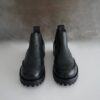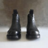Su suela robusta tipo tractor, con aplicaciones de cuero, está lijada y teñida a mano en un sobrio negro mate. El cerco va cosido a la suela con la técnica de cosido «welt», lo que refuerza su estructura y evita que se despegue con el tiempo.