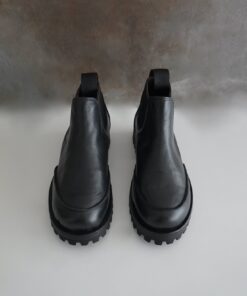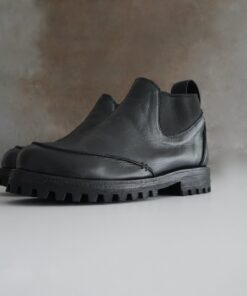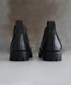 Su robusta suela tipo tractor, con aplicaciones de cuero, está lijada y teñida a mano en un sobrio negro mate. El cerco va cosido a la suela con la técnica de cosido «welt», lo que refuerza su estructura y evita que se despegue con el tiempo.