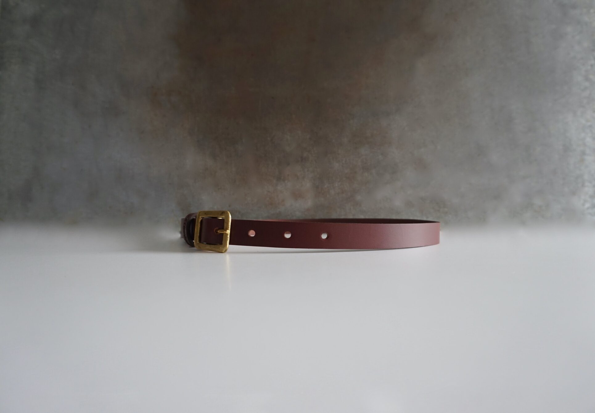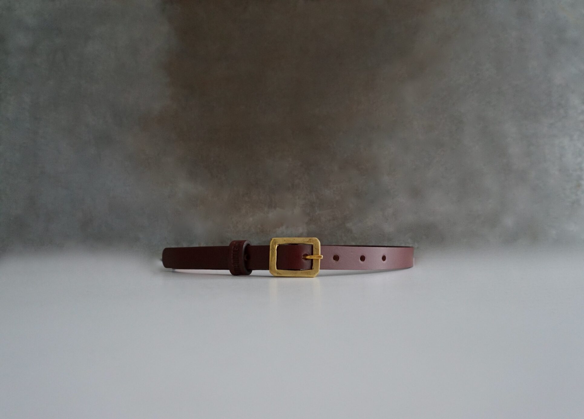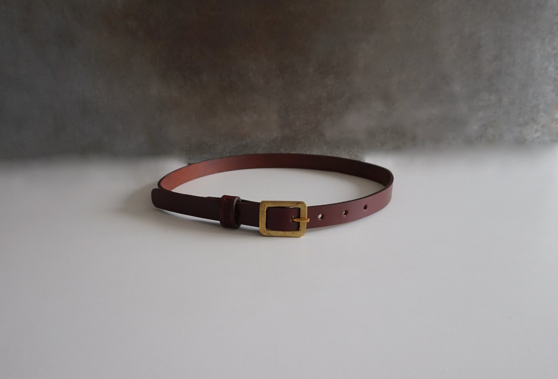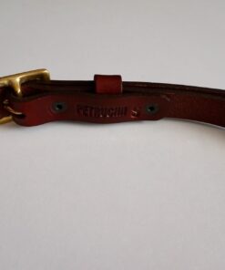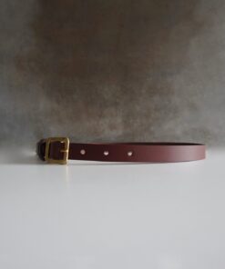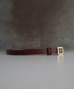 Cinturón fino, confeccionado al canto en piel de curtido vegetal en color marrón rojizo, con una hebilla de latón fundido hecha a mano, fundido en acabado envejecido, creando una pátina única con el tiempo.