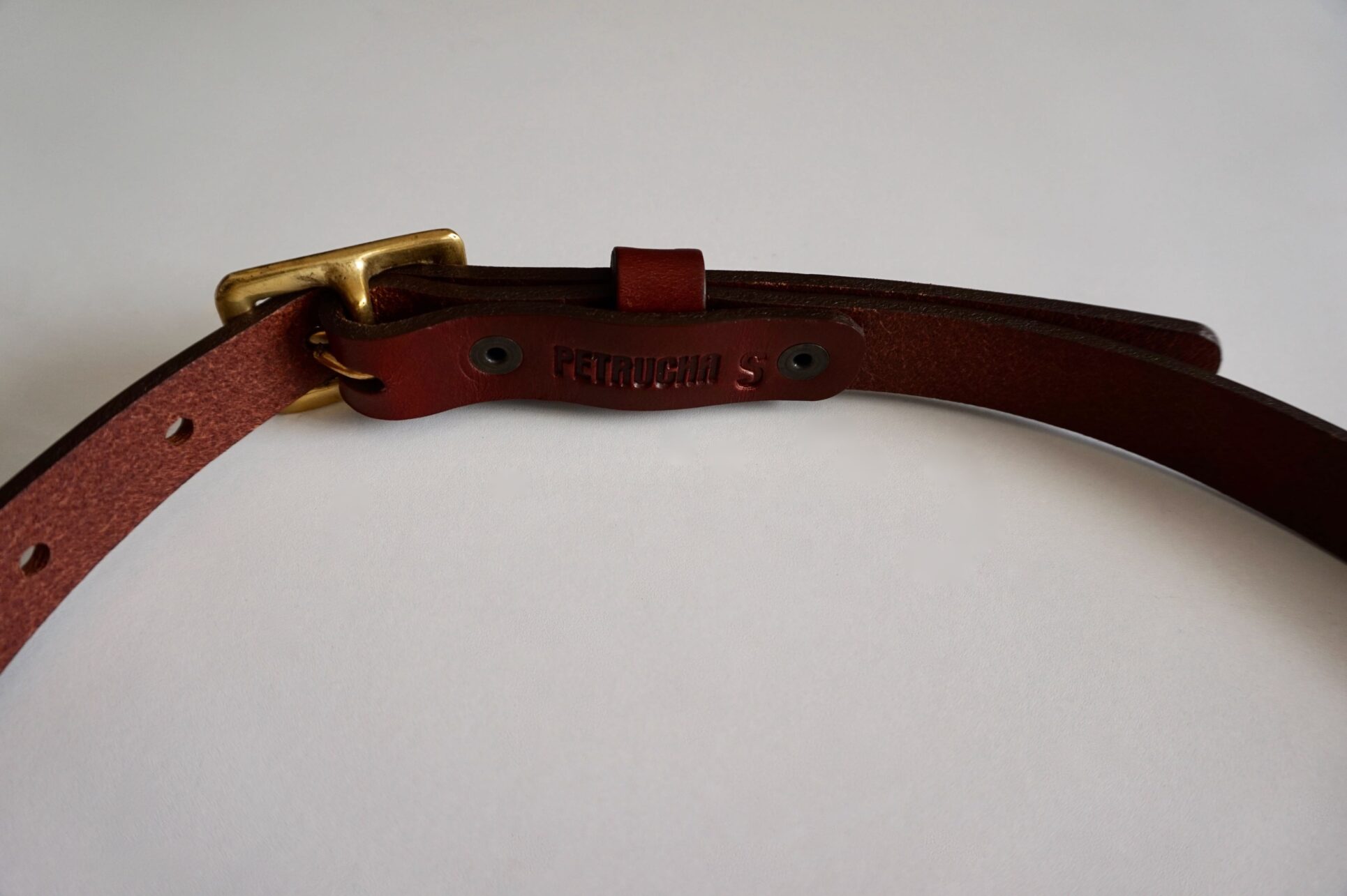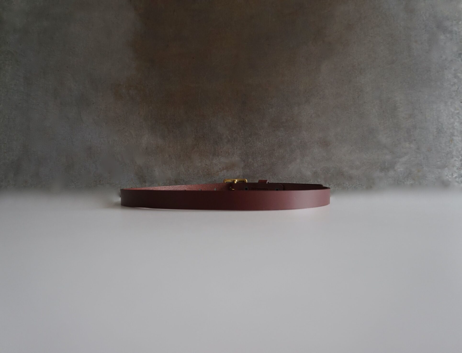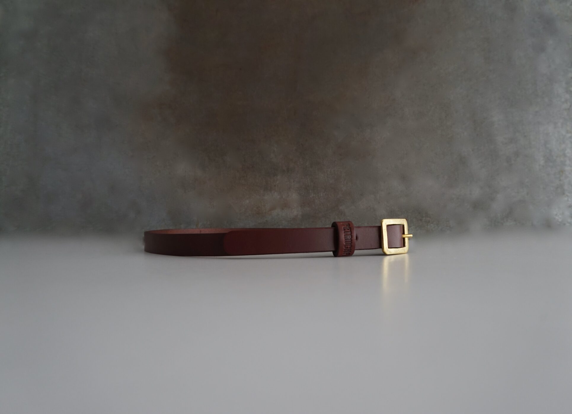 Cinturón fino, confeccionado al canto en piel de curtido vegetal en color marrón rojizo, con una hebilla de latón fundido hecha a mano, fundido en acabado envejecido, creando una pátina única con el tiempo.